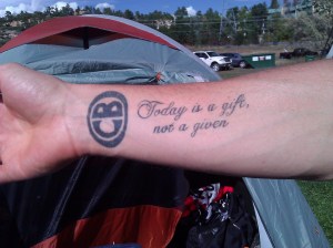 Eighteen hours also remain for Team FliByeRacing. Steve, Andy, Todd, and Ian alternate laps in the four-man open classification. At about 6:15 Todd rides into the team transition area, passes his yellow Velcro timing anklet to teammate Andy, then makes his way to the team’s camp, a tent about 50 yards from camp White, to rest for three hours until his next turn. Team FliByeRacing’s pace of 64 minute laps earns second place so far. It’s an excellent start toward a podium goal.