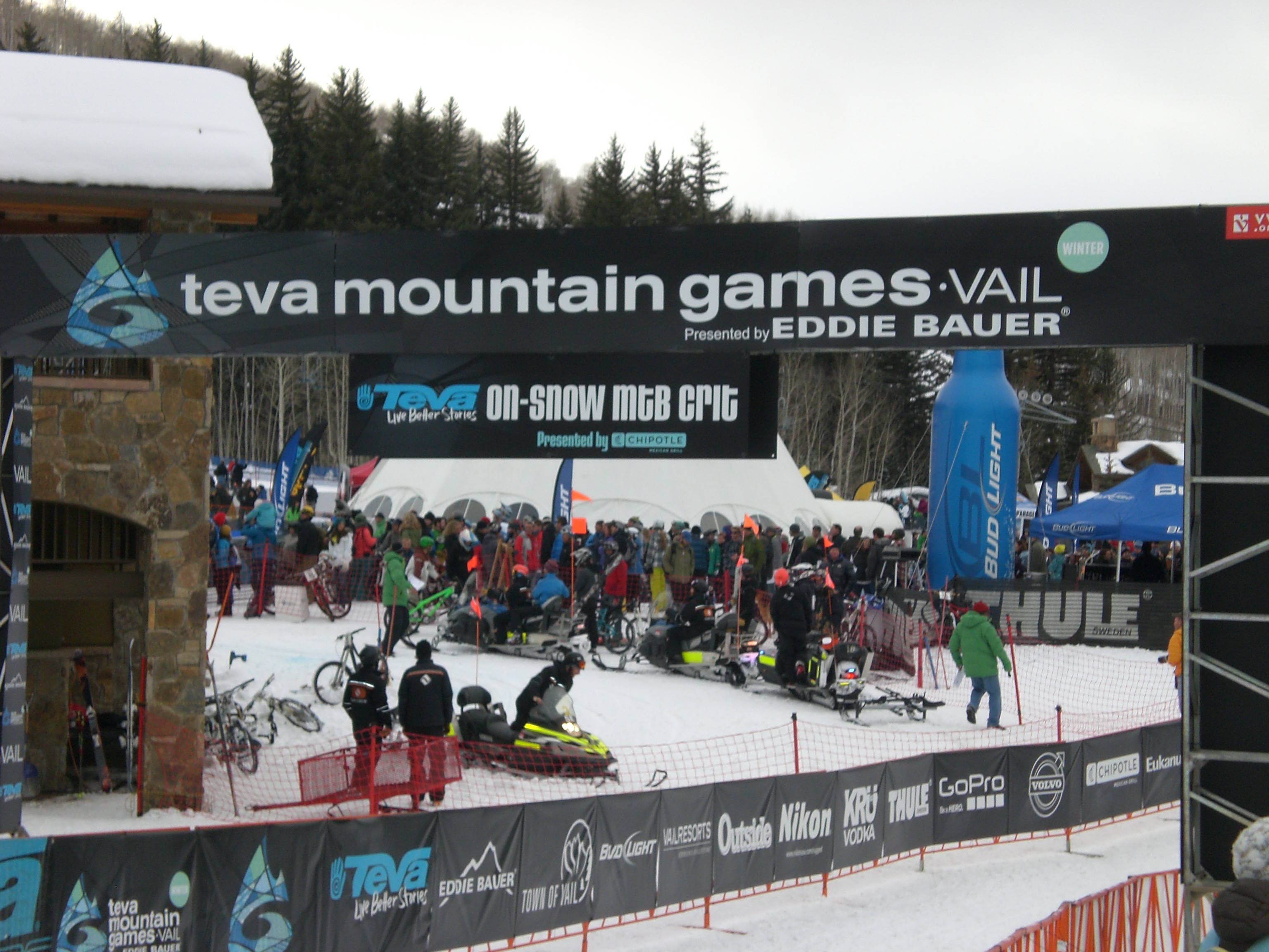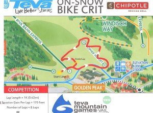 On February 11, 2012 the Teva Winter Mountain Games hosted a snow crit race in Vail with cash prizes for mountain bike and snow bike categories. Women and men in both categories touched only snow after they sped off at 5 p.m. in soft but cold post-sunset light.
