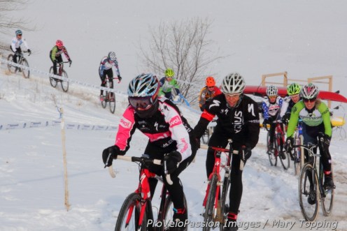 Unphased by bitter cold, Kristen Peterson gets first elite cyclocross win at Boulder Rez » Jess D’Amato leads a group away from the reservoir beach
